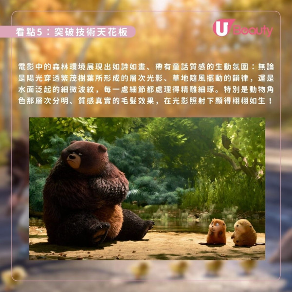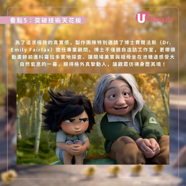 Pixar再次挑戰特技極限,邀請科學家顧問實地考察,以全新技術打造出光影細膩、毛髮栩栩如生的童話森林,讓觀眾在如詩如畫的自然奇觀中感受身歷其境的視覺震撼。