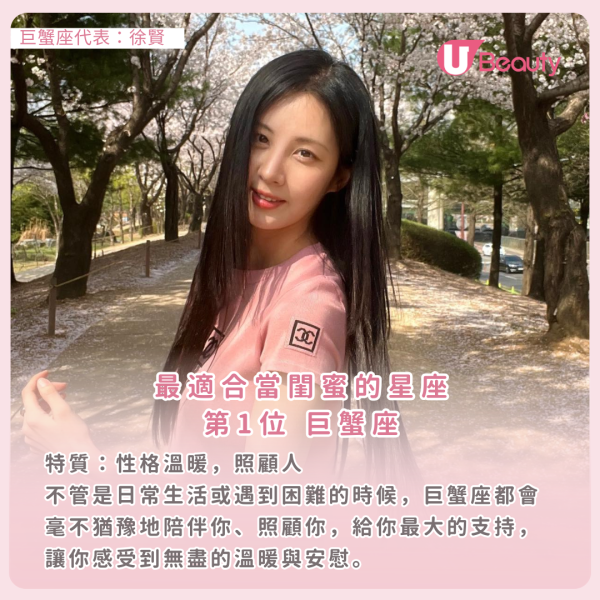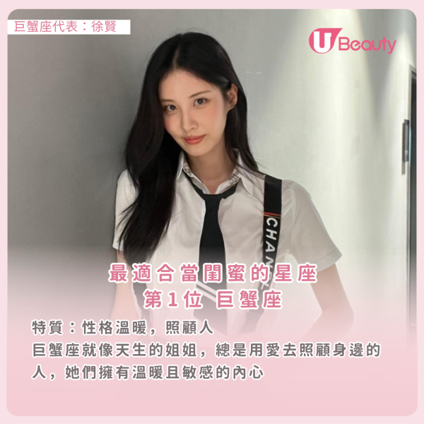 巨蟹座就像天生的姐姐,總是用愛去照顧身邊的人,她們擁有溫暖且敏感的內心,不管是日常生活或遇到困難的時候,都會毫不猶豫地陪伴你、照顧你,給你最大的支持,讓你感受到無盡的溫暖與安慰。