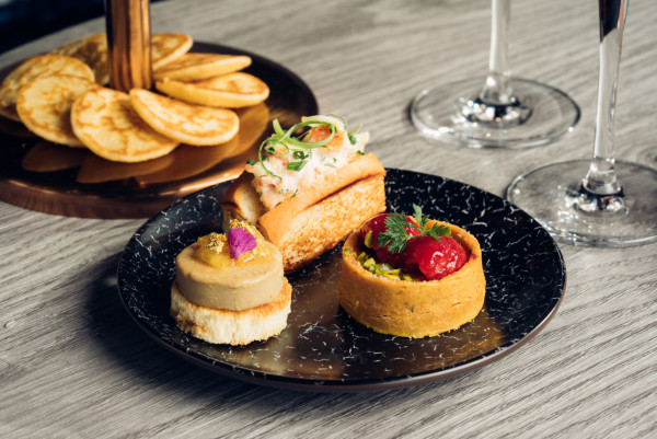 香港 W 酒店是次將聯乘 Telmont Réserve Brut NV 香檳,呈獻一系列精緻節慶鹹甜佳餚。先以兩杯 Telmont Réserve Brut NV 香檳,配上尊貴 W 魚子醬打開味蕾;再配上多款鹹點小食,如煙燻希靈魚芝士三文治、龍蝦沙律包、以及法式鵝肝醬配鳳梨醬等經典滋味;甜品方面,行政糕點總廚顏健邦師傅將 Remy Martin 干邑注入兩款甜品—干邑葡萄馬卡龍和核桃巧克力球之中,味道濃郁,香氣醉人之餘,營造出獨特而難忘的美妙滋味。紅桑子芝士蛋糕以聖誕鈴鐺造型設計,榛子聖多諾黑和栗子蒙布朗等誘人甜點亦造型感十足。