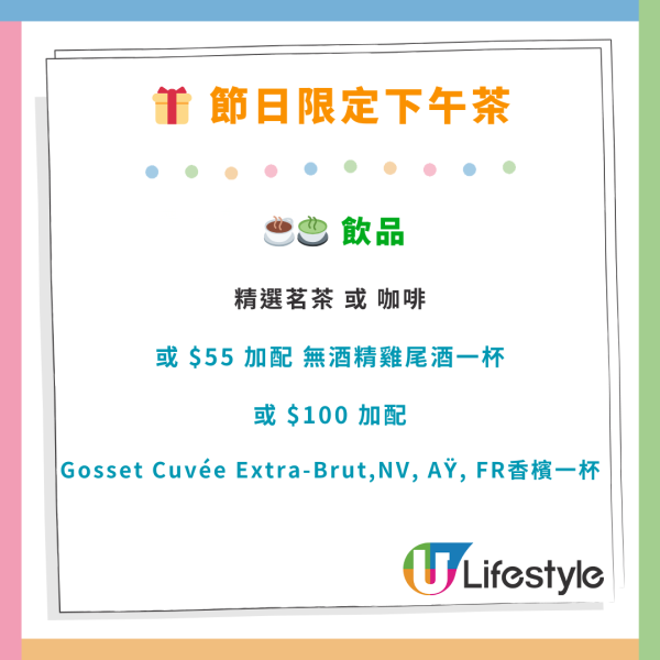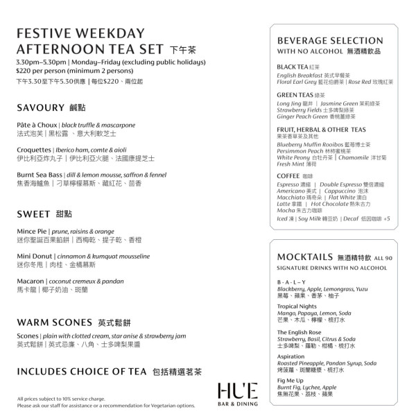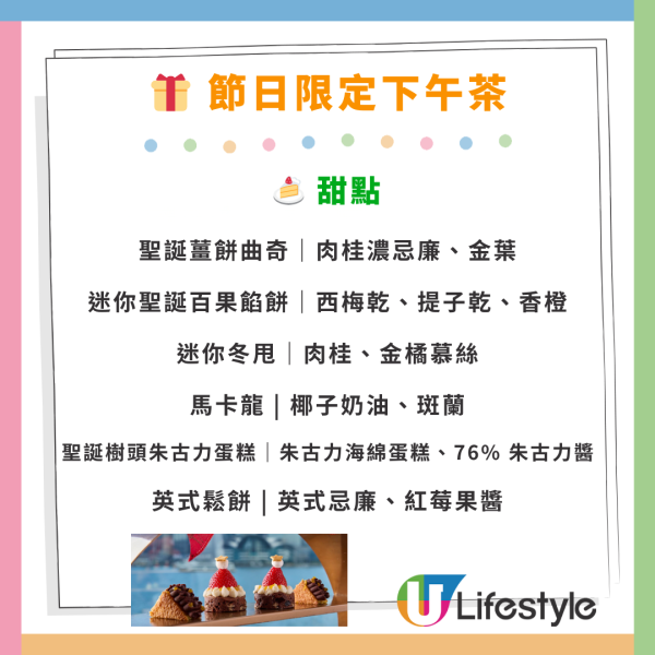 * 節日限定下午茶於11月23日至12月31日期間,逢星期六、日及公眾假期 3:30pm 至 5:30pm 時段限定供應。(12月24、25及31日除外)