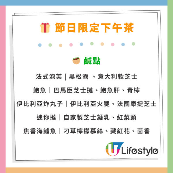 👉🏻 節日限定下午茶包括11款鹹甜點:黑松露芝士法式泡芙、伊比利亞火腿炸丸子、聖誕薑餅曲奇等