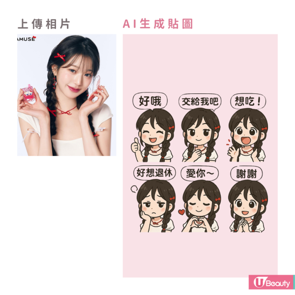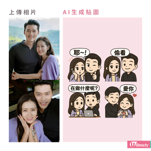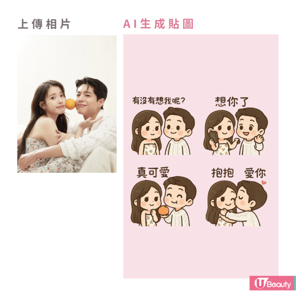 先上傳1-3張相片,最好選取面部輪廓較清晰的照片。配合表情豐富、半身/全身照片能給予AI不錯的設計靈感。情侶貼圖的話,不妨選你們的合照或甜蜜互動相片。