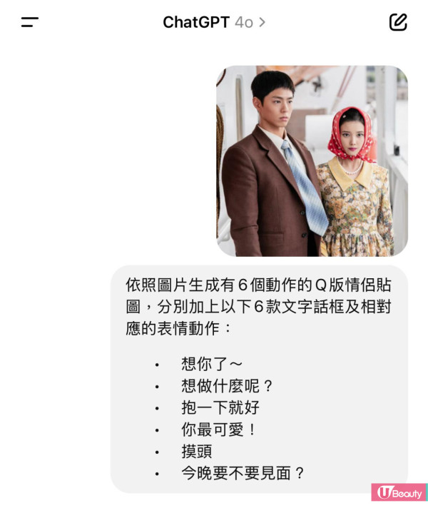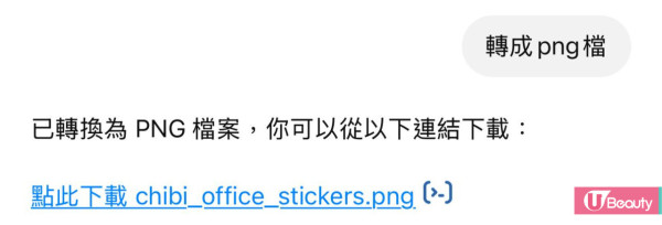 圖片預設為白底,而製作貼圖或 IG 貼紙會需要透明背景的png圖檔,這部分 ChatGPT也能幫你轉檔,立即輸出乾淨透明版本。