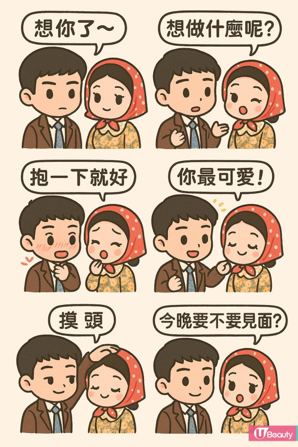 依照圖片生成有6個動作的Q版情侶貼圖,分別加上以下6款文字話框及相對應的表情動作: