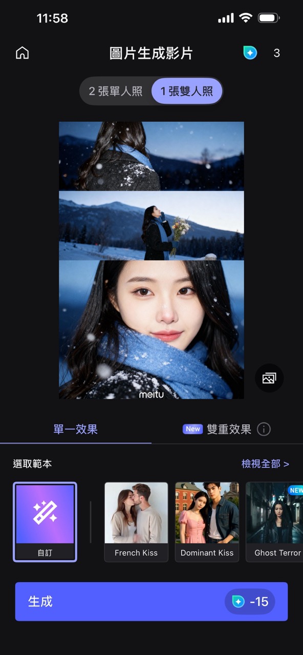 大家可以先在「美圖秀秀」手機應用程式的限時雪景照功能中生成圖片。目前實測顯示,免費用家每日可以生成零廣告生成5張AI雪景照,及後的生成會隨機出現廣告,需要睇完廣告,才能下載圖片。