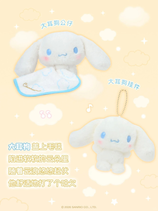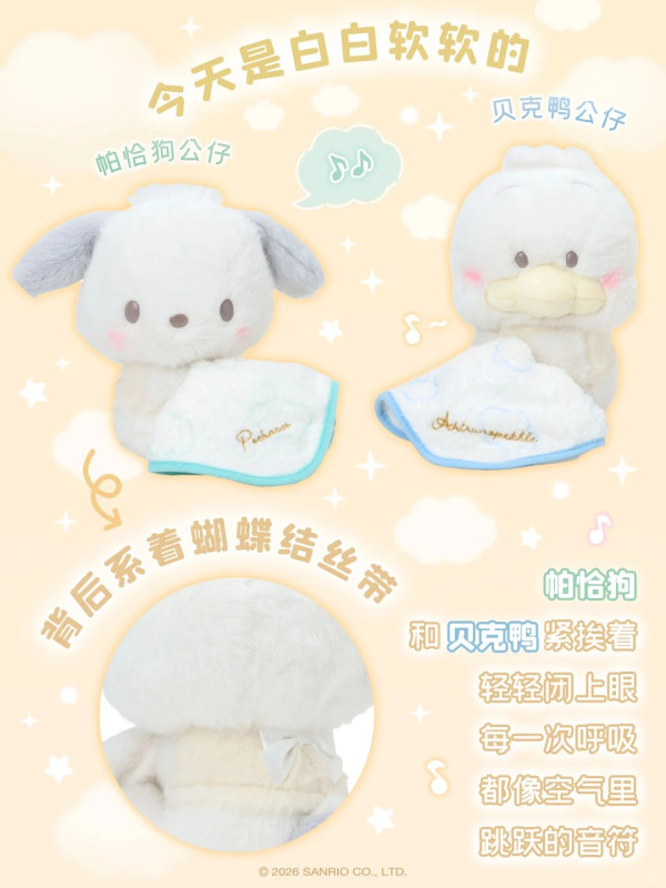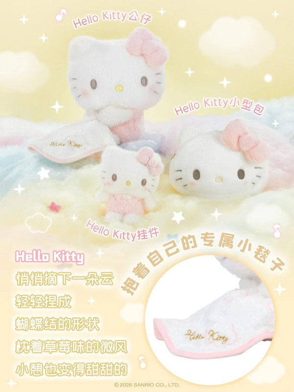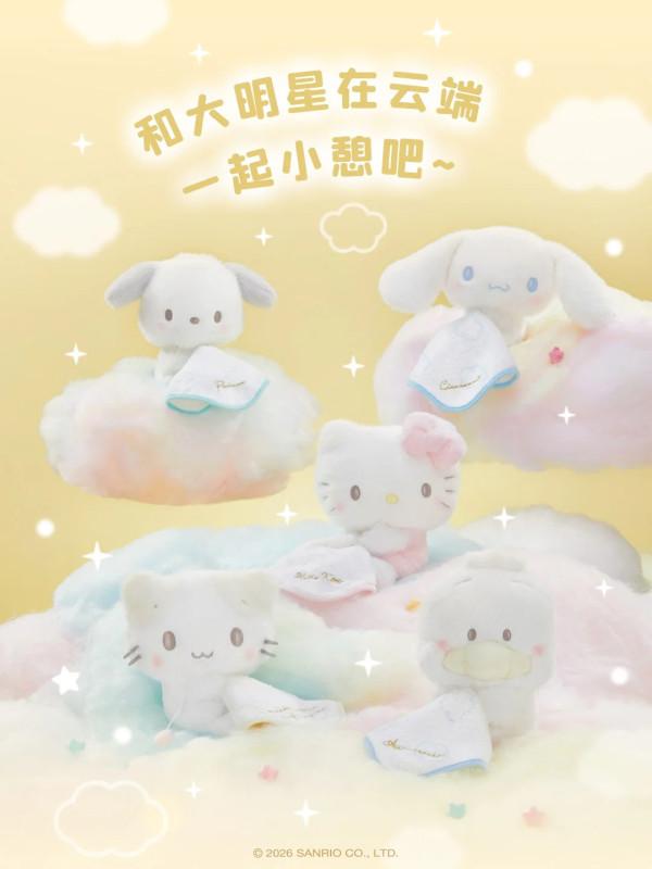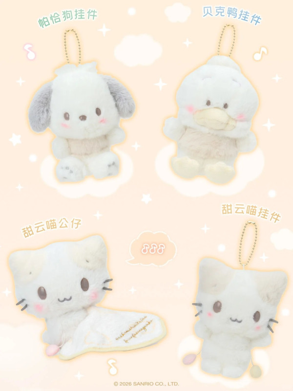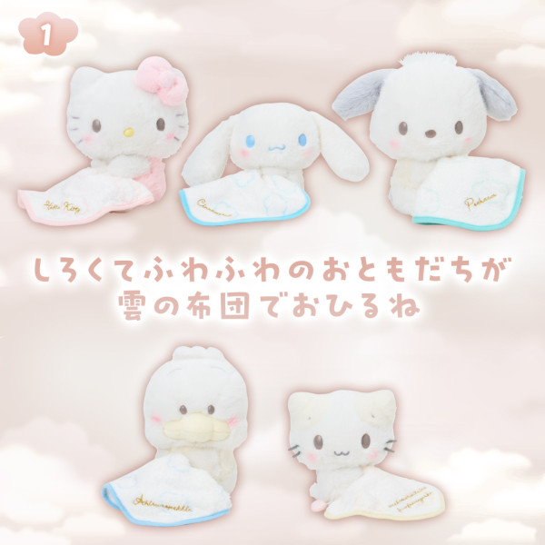 最受觸目的當然是毛公仔!這次的設計非常有巧思,角色們手裡都抱著一張刺繡了名字的小被被,呈現出一副睡眼惺忪、準備午睡的模樣。毛料採用了激似棉花糖的軟綿綿材質,手感極佳! 除了 Hello Kitty 和 玉桂狗,還有近期人氣急升的 PC狗 (Pochacco) 和 AP鴨 (Ahirunopekkle)!