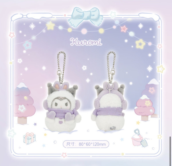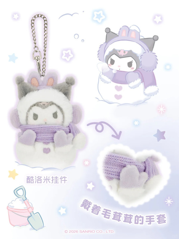 雖然是酷酷的 Kuromi,但變成雪人後也難掩萌樣!紫色系的圍巾與耳罩,配上她標誌性的黑色頭巾(這次做了淡化柔和處理),展現出不一樣的溫柔感。