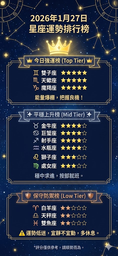 【2026年1月27日每日運程】今日星象兩極分化!雙子、魔羯與天蠍能量攻頂,財運事業大豐收;白羊、天秤與雙魚則需保守應對,切勿強出頭。立即查看12星座綜合、愛情、事業及財運5星評分,掌握你的今日開運指南!