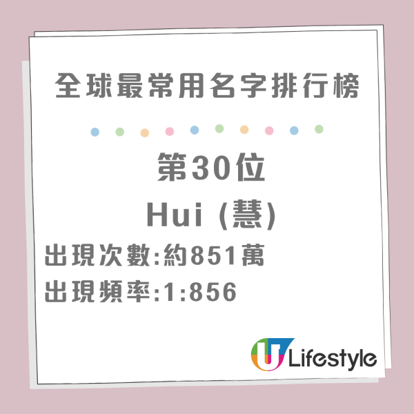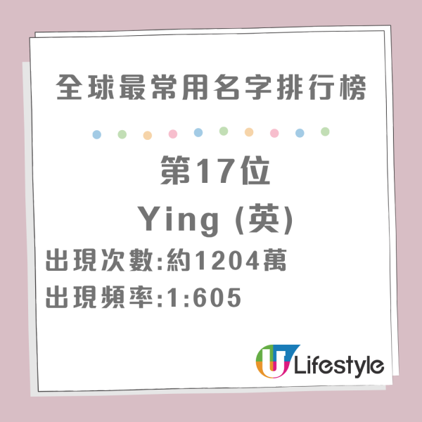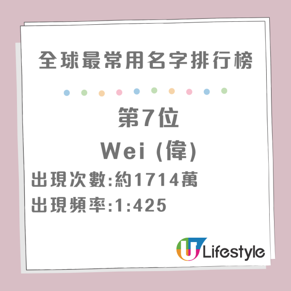 在全球範疇內,亞洲男性名字中每 425 個人就有一個名字叫 Wei,偏女性向的如 Yan、Ying、Hui、Mei 及 Fang 等在女性名字中出現頻率極高,反映出傳統命名習慣的影響。
