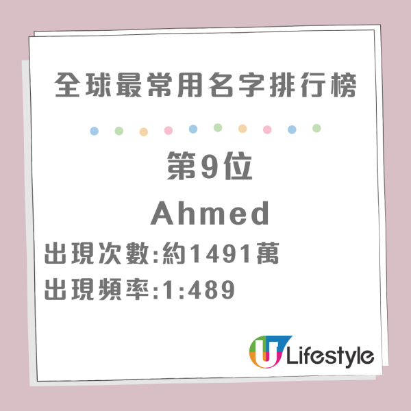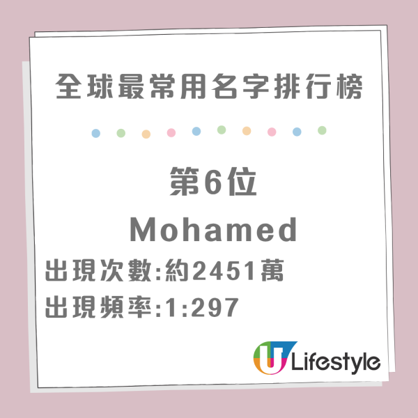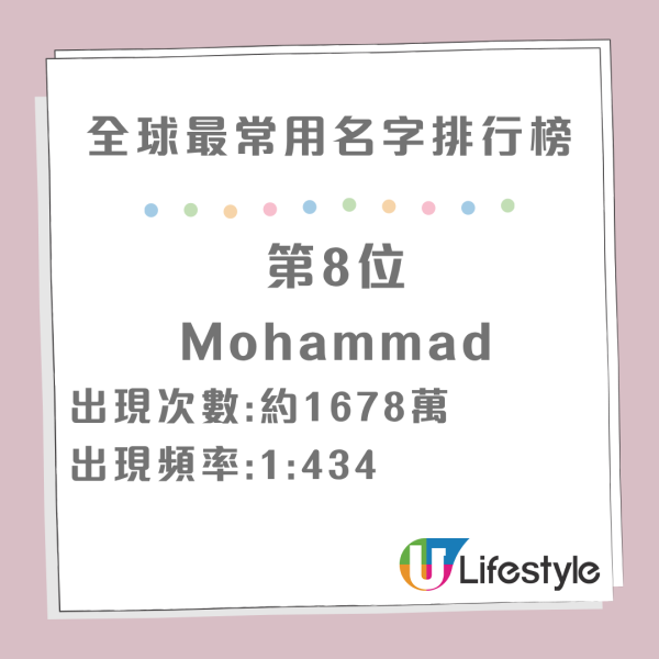 統計顯示,「Maria」 以全球超過 6,100 萬的出現次數奪得第一名!頻率高達 1:119,意味著你在街上隨便遇到 100 多人,很有可能就有一位叫 Maria。這歸功於它在歐洲、拉丁美洲及菲律賓等地的極高普及率。如果將不同的拼法合併計算,Mohammed / Muhammad / Mohamed / Mohammad 這組名字絕對是男生的王者。單是榜單前 10 名中,這幾個變體就佔了 4 個席位,加起來的總人數高達數億,反映出穆斯林文化的深厚影響力。