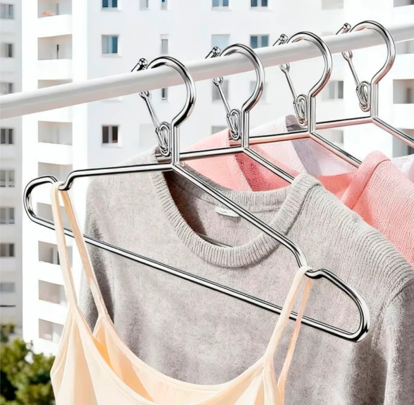 如果晾曬比較大型或重型的服飾,大家可以利用多重衣架的方法,將多個衣架一正一反地連動在一起,這樣有助增加整體的重量與慣性,使風力難以輕易晃動整個結構。