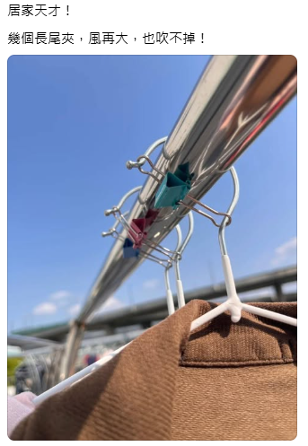 近日Threads上有位台灣網友,分享了一個引來不少關注的晾衫秘技,網友利用衣架配合長尾夾晾衣,更表示「風再大,也吹不掉」。因為長尾夾能夠增加摩擦力與固定衣架重心, 減低強風引致的衣架傾斜,或被風捲走、吹落的機率。雖然這個晾衣組合的確能夠達至一定的防風效果,不過網民反應兩極,亦有些網民提醒強風時的成效。