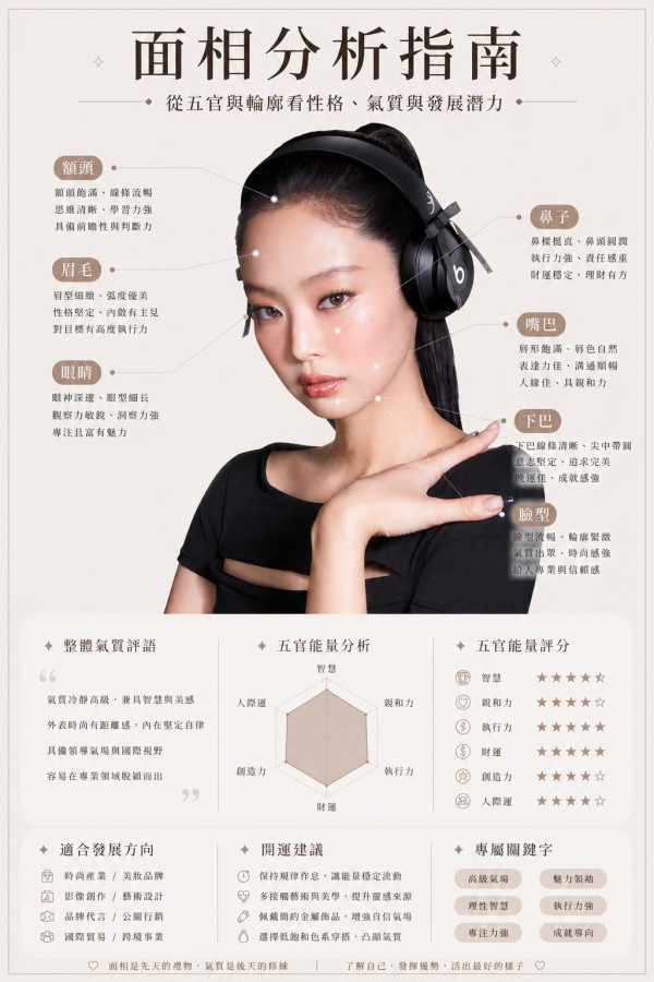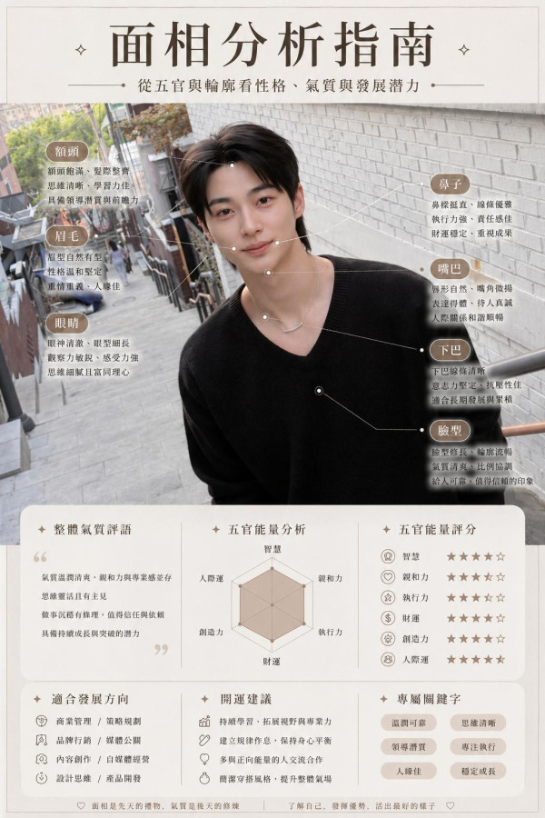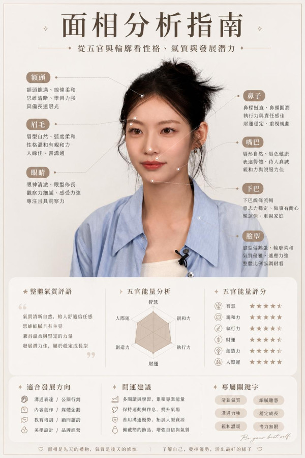 注意: 不要做成迷信感太重,要像「氣質分析/形象顧問/面相美學」風格,文字不要太多,不要長段落,重點視覺化呈現。」