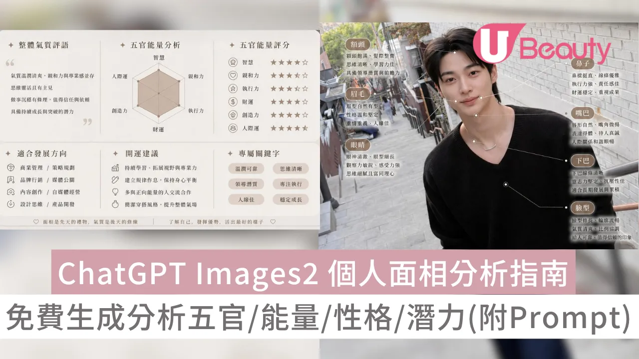 ChatGPT Images2|AI面相|面相分析|近年 AI 科技已經滲透到我們的美容生活,除了虛擬試妝、AI 穿搭分析,最近在社交平台掀起了一股 「AI 面相分析」 熱潮!只需利用 ChatGPT Image2 的影像分析功能,就能為自己量身打造一張極具質感的「面相分析指南」。今次 U Beauty 為大家實測這項功能,並公開「一鍵生成」的指令製作出專業的面相圖文!