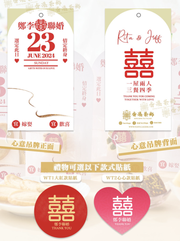 這款回禮茶點結合心意吊牌 ,將創意與心意二合一,為來賓送上祝福!心意卡以通勝吉日設計,傳統卻不過於老派,極有香港地道特色!茶點方面,除了蝴蝶酥外,還有雪花酥、曲奇及即沖黑糖方塊等可供選擇。