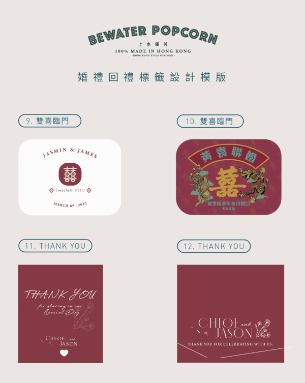 提供多款口味的爆谷,包括傳統的焦糖、朱古力,還有創新的粟米肉粒、奶醬多等等,並附有多種婚禮回禮標籤設計選擇,適合不同風格的婚宴場合!訂購100件或以上最低每件HK$16,CP值極高,簡簡單單亦可表達謝意。