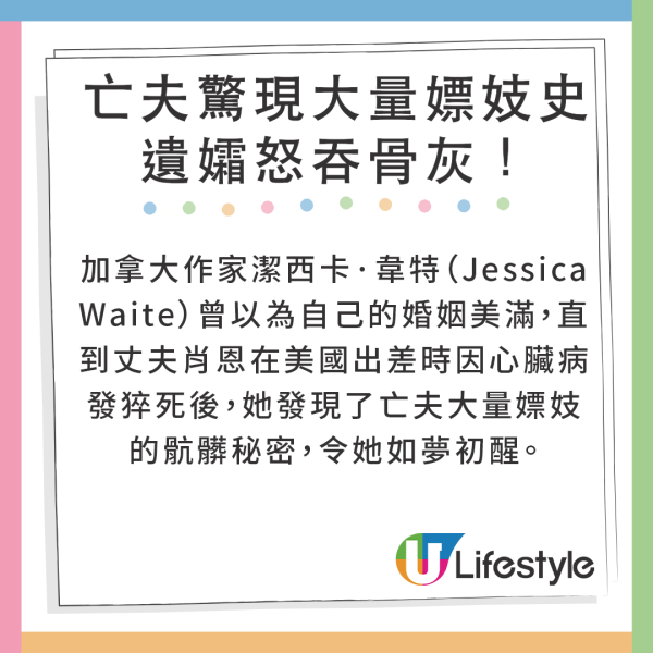 加拿大作家潔西卡·韋特(Jessica Waite)曾以為自己的婚姻美滿,直到丈夫肖恩在美國出差時因心臟病發猝死後,她發現了他大量嫖妓的骯髒秘密,令她出書報復甚至怒吞骨灰!