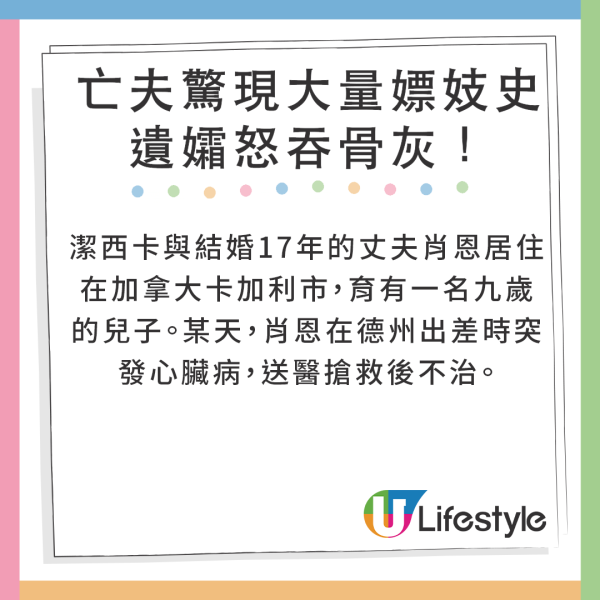 根據外媒報導,潔西卡與結婚17年的丈夫肖恩居住在加拿大卡加利市,育有一名九歲的兒子。某天,肖恩在德州出差時突發心臟病,送醫搶救後不治。幾天後,潔西卡在查找休士頓醫院電話時,無意中發現了肖恩的iPad上令人不安的搜尋記錄,其中包括「地點…女孩…服務…價格」等字眼。後來,潔西卡發現越來越多的證據顯示,她一直以為忠誠的丈夫其實是一名慣常嫖妓者,並且在網上收集了大量淫穢圖像。