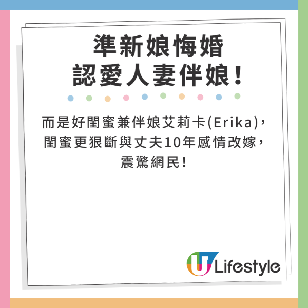 根據外媒報導,準新娘Kayla在2021年與客戶丹(Dan)的妻子艾莉卡(Erika)認識,二人十分投契所以迅速成為好閨蜜,甚至還經常一起出去玩。後來Kayla在大學時期認識的男朋友哈利(Harry)向她求婚,Kayla答應後總覺得不對,心中似乎有種說不出的壓力。 得知Kayla接受了求婚的Erika發現自己對Kayla早已萌生愛意,便決定在Kayla婚前向她表白。