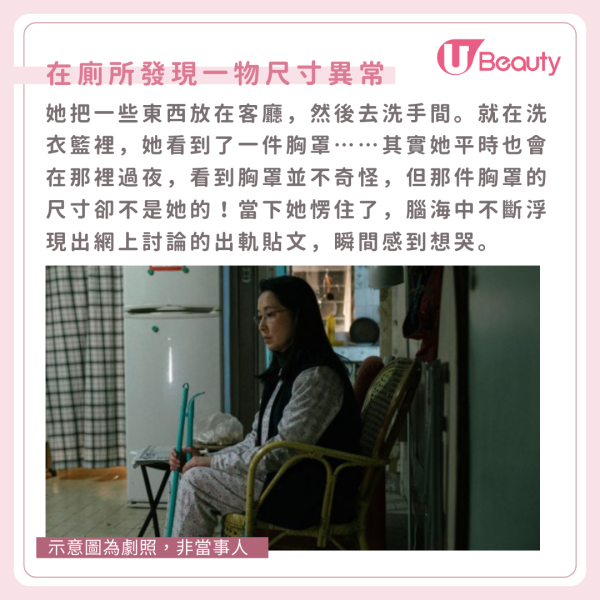 她把一些東西放在客廳,然後去洗手間。就在洗衣籃裡,她看到了一件胸罩……其實她平時也會在那裡過夜,看到胸罩並不奇怪,但那件胸罩的尺寸卻不是她的!當下她愣住了,腦海中不斷浮現出網上討論的帖子,瞬間感到想哭。她立刻穿上褲子衝出洗手間。
