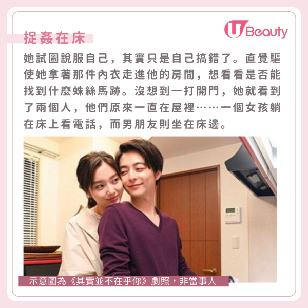 她試圖說服自己,其實只是自己搞錯了。直覺驅使她拿著那件內衣走進他的房間,想看看是否能找到什麼蛛絲馬跡。沒想到一打開門,她就看到了兩個人,他們原來一直在屋裡……一個女孩躺在床上看電話,而男朋友則坐在床邊。他驚訝地望著她,那個女孩似乎也被嚇到了。她手裡拿著胸罩問道:「這是誰的?」內心不斷祈求他能過來安慰自己,告訴她這只是誤會,那個女孩是他的表妹或者妹妹,只要解釋清楚就好。