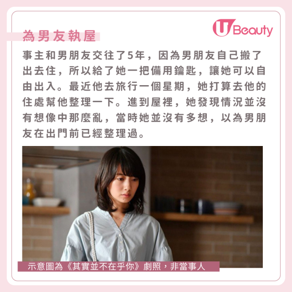 事主和男朋友交往了5年,雖然相處了一段時間,但因為男朋友自己搬了出去住,所以至今還未見過他的家人。男朋友給了她一把備用鑰匙,讓她可以自由出入。最近,他出了一趟旅行,已經離開了一整個星期,她打算去他的住處,順便幫他整理一下。進到屋裡,她發現情況並沒有想像中那麼亂,當時她並沒有多想,以為男朋友在出門前已經整理過。