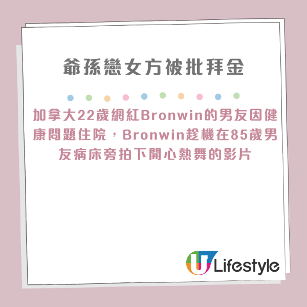 一位在加拿大的22歲網紅(Bronwin Aurora)在社交平台以性感內容吸引粉絲外,她與85歲男友的短片都十分引人入勝,早前她便趁男友卧病在床期間在社交平台大爆男友已經加了她的名字落遺囑,更問廣大網口她應否讓男友「提早升天」掀熱議。