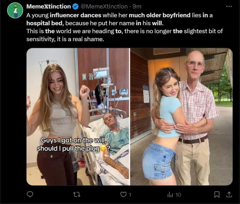 加拿大22歲網紅Bronwin的男友因健康問題住院,Bronwin趁機在85歲男友病床旁拍下開心熱舞的影片,在影片中Bronwin先親吻男友的臉頰,隨後開始熱舞,面露笑容興奮地表示男友已將她寫入遺囑,確保能繼承遺產的她開玩笑地問道「我應該拔掉插頭嗎?」,男友卻看起來病懨懨,面無表情地注視著她,這段影片最近被重新分享後迅速獲得超過120萬次觀看,引發網友的激烈反應。