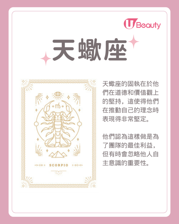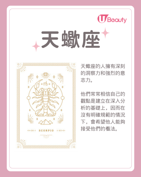 天蠍座的人擁有深刻的洞察力和強烈的意志力。他們常常相信自己的觀點是建立在深入分析的基礎上。