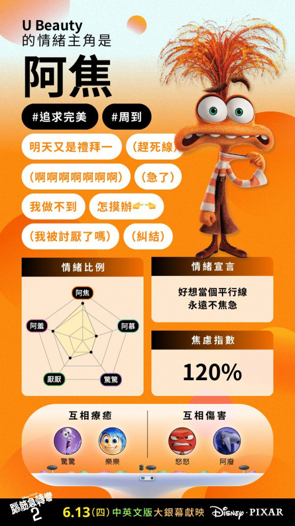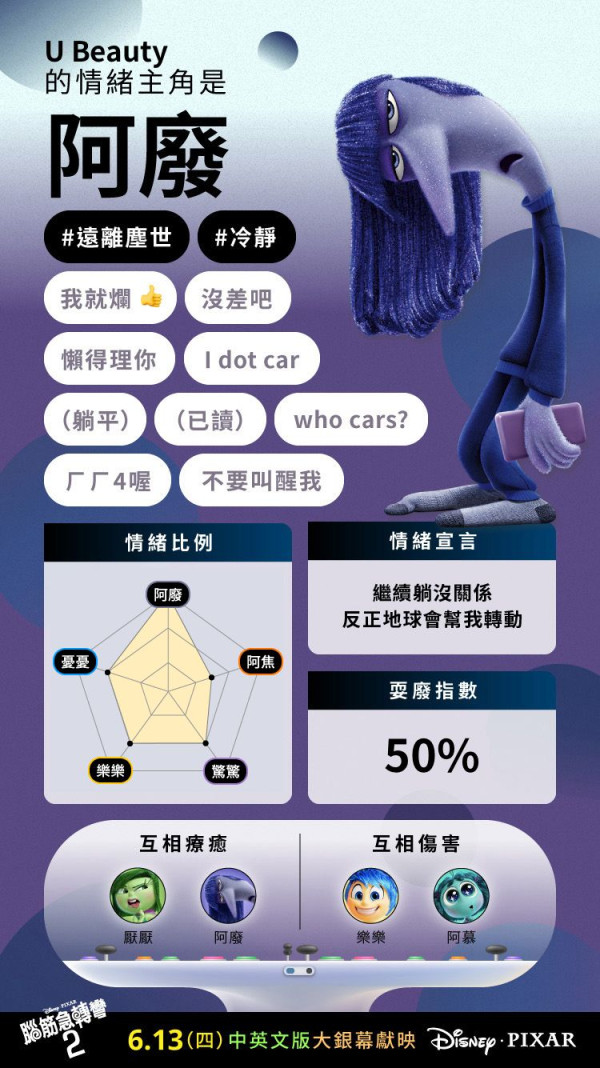 為了宣傳電影《腦筋急轉彎2》,迪士尼推出了一個名為「EMO小劇場」的心理測驗,讓觀眾可以找出自己的「情緒主角」。測驗包含9個情境式問題,涵蓋日常生活中的各種情況。