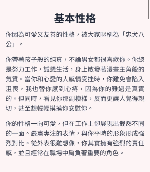 你因為可愛又友善的性格,被大家暱稱為「忠犬八公」。你帶著孩子般的純真,不論男女都很喜歡你。你總是努力工作,誠懇生活,身上散發著漫畫主角般的氣質。當你和心愛的人感情受挫時,你難免會陷入沮喪,我也替你感到心疼,因為你的難過是真實的。但同時,看見你那副模樣,反而更讓人覺得親切,甚至想輕輕摸摸你安慰你。
