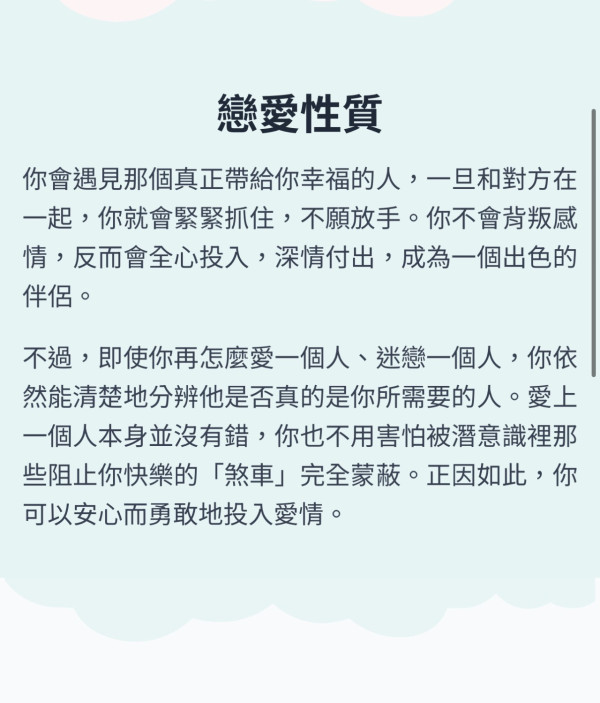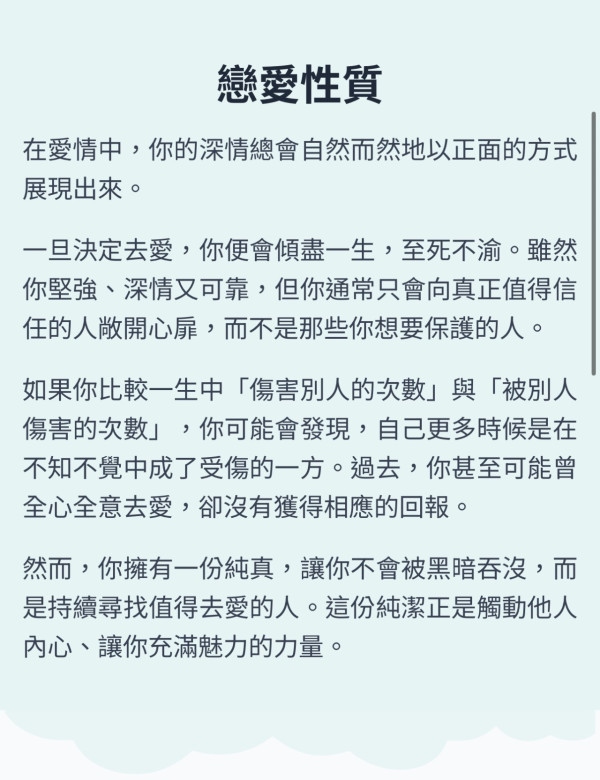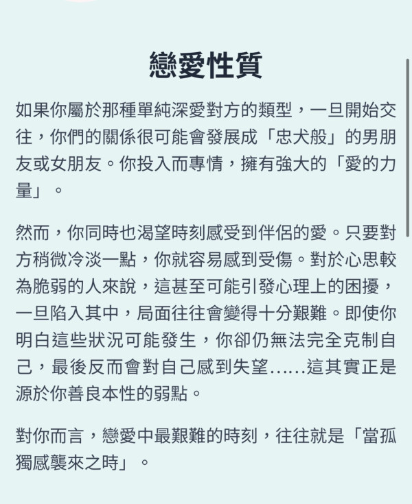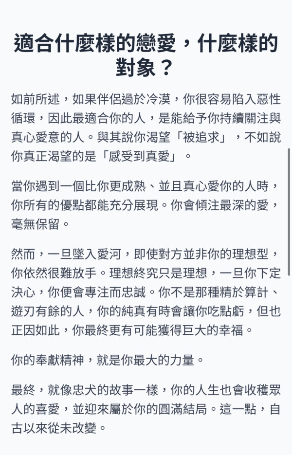 然而,一旦墜入愛河,即使對方並非你的理想型,你依然很難放手。理想終究只是理想,一旦你下定決心,你便會專注而忠誠。你不是那種精於算計、遊刃有餘的人,你的純真有時會讓你吃點虧,但也正因如此,你最終更有可能獲得巨大的幸福。你的奉獻精神,就是你最大的力量。最終,就像忠犬的故事一樣,你的人生也會收穫眾人的喜愛,並迎來屬於你的圓滿結局。這一點,自古以來從未改變。