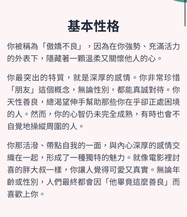 你那活潑、帶點自我的一面,與內心深厚的感情交織在一起,形成了一種獨特的魅力。就像電影裡討喜的胖大叔一樣,你讓人覺得可愛又真實。無論年齡或性別,人們最終都會因「他畢竟這麼善良」而喜歡上你。
