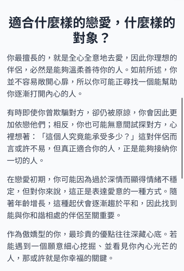 在戀愛初期,你可能因為過於深情而顯得情緒不穩定,但對你來說,這正是表達愛意的一種方式。隨著年齡增長,這種起伏會逐漸趨於平和,因此找到能與你和諧相處的伴侶至關重要。作為傲嬌型的你,最珍貴的優點往往深藏心底。若能遇到一個願意細心挖掘、並看見你內心光芒的人,那或許就是你幸福的關鍵。