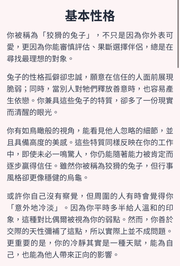 你被稱為「狡猾的兔子」,不只是因為你外表可愛,更因為你能審慎評估、果斷選擇伴侶,總是在尋找最理想的對象。兔子的性格孤僻卻忠誠,願意在信任的人面前展現脆弱;同時,當別人對牠們釋放善意時,也容易產生依戀。你兼具這些兔子的特質,卻多了一份現實而清醒的眼光。