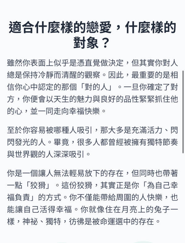 你是一個讓人無法輕易放下的存在,但同時也帶著一點「狡猾」。這份狡猾,其實正是你「為自己幸福負責」的方式。你不僅能帶給周圍的人快樂,也能讓自己活得幸福。你就像住在月亮上的兔子一樣,神祕、獨特,彷彿是被命運選中的存在。