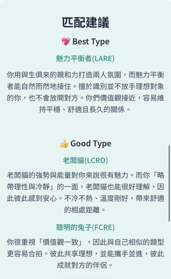 透過這四個維度的交叉分析,LoveType 16 就能描繪出妳在關係中的行為準則與深層渴望。每個類型結果會由四個字母的代碼(例如:LCRO)和一個親切有趣的角色名稱組成。它不只適用於單身者釐清「自己適合什麼樣的人」,也適合穩定交往中的情侶了解「如何行動能讓關係更順利」。