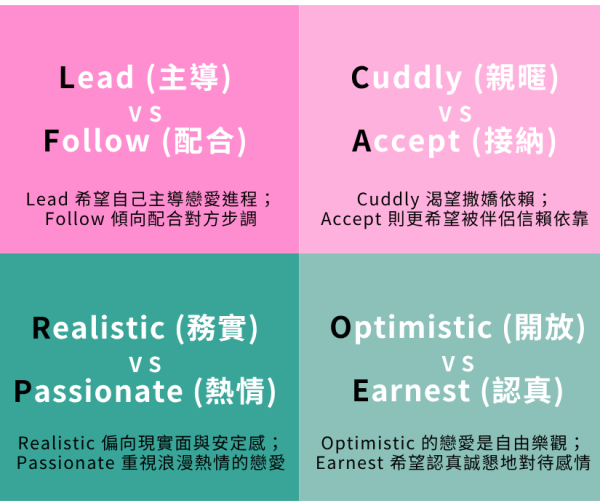 這個診斷的結構很簡單:它由四個軸線(每軸兩個選項)構成,這些選項的不同組合最終形成16種戀愛類型。