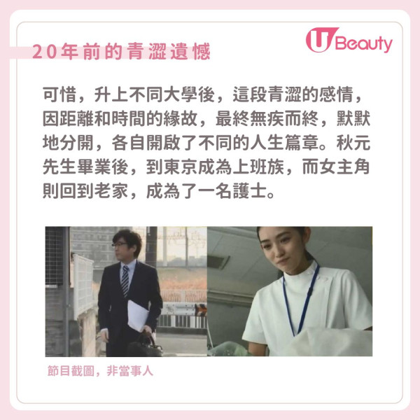 重逢初見時,秋元先生因為尷尬和害羞,一直不敢主動開口。在療傷期間,他觀察到女方手上並沒有戴著結婚戒指,意味著自己還有機會,但卻依然沒有開口。就在秋元先生準備離開醫院時,女方沒有選擇默默送別,反而在門口等他,更一起走到巴士站。期間,女方主動打開話題,打破了長達20年的沉默。她坦承當年的遺憾和經歷。這一刻,兩人終於確彼此都抱著遺憾!這次,他們不再退縮,各自鼓起勇氣,堅定地抓住了命運的紅線,不想再留下任何遺憾!這份跨越20年的堅定情感,讓他們關係迅速升溫,並在不久的將來,直接決定踏入婚姻殿堂,讓遺憾徹底變成幸福的序曲!