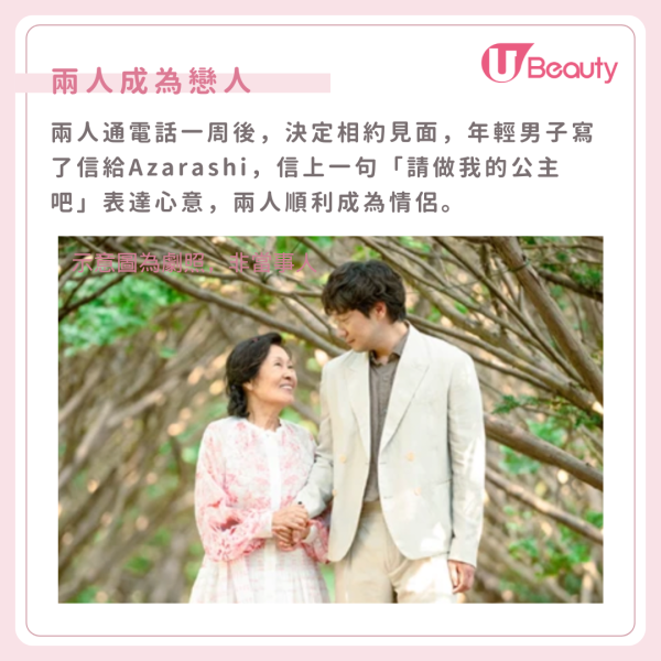 兩人通電話一周後,便決定相約見面,年輕男子寫了封信給Azarashi,信上一句「請做我的公主吧」,向Azarashi表達心意,兩人順利成為情侶。交往一個月後,Azarashi在網上發文分享男友晚上早睡,隨即引起不少網民憂心,並推測男友可能是已婚男,Azarashi看到留言後便質問男友「你是不是結婚了?如果是,我們立刻分手」,男友馬上提供駕照澄清,以示清白,男友誠實的解釋,也讓Azarashi不再隱瞞自己的歲數,剖白兩人其實相差32年。不過男友未有被Azarashi的年齡嚇到,也沒有因此而分手,反而決定結婚,陪伴彼此到老。