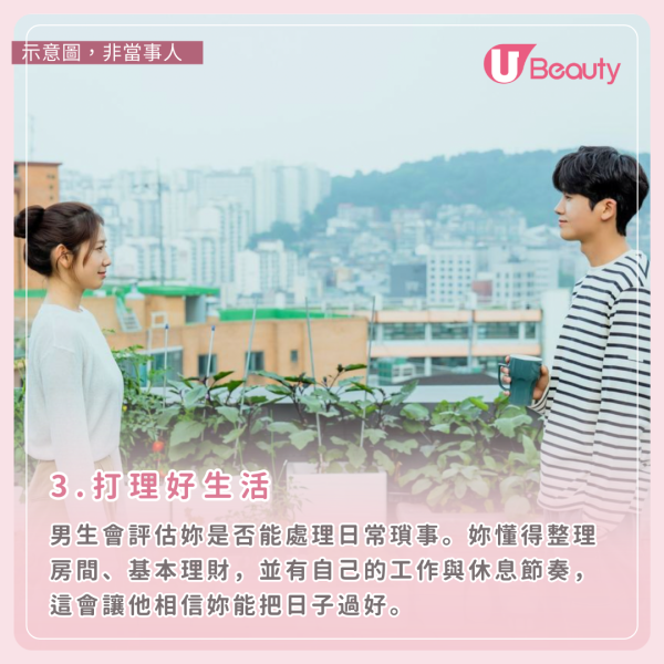 結婚遠不止約會拍照那麼簡單,男生會評估妳是否能處理日常瑣事。妳懂得整理房間、基本理財,並有自己的工作與休息節奏,這會讓他相信妳能把日子過好。當他開始想像未來與妳一起煮飯、分擔家務,其實已在心裡將妳列為「另一半」的候選人!