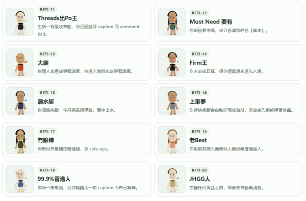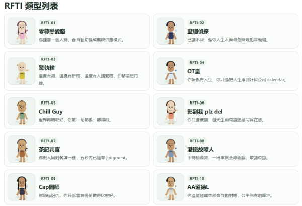 你還在問人「你是F人還是J人?」那就Out了!近日名為RFTI的「人格測試」在各大社交平台惹起熱議,能精準捕捉香港人的「內心」,網民紛紛直呼:「RFTI比MBTI更貼地!」