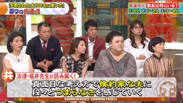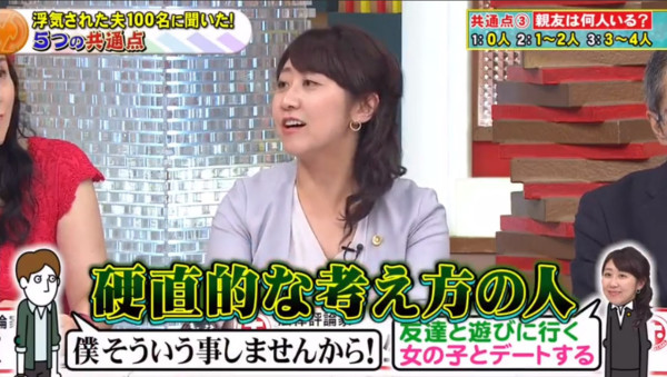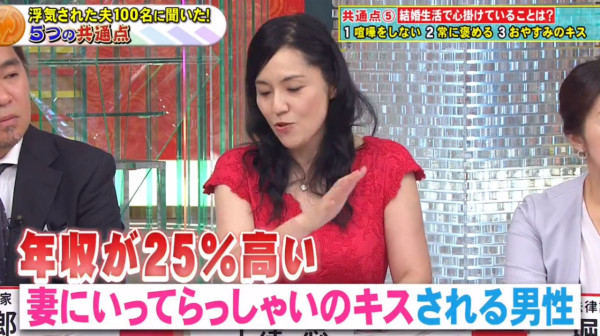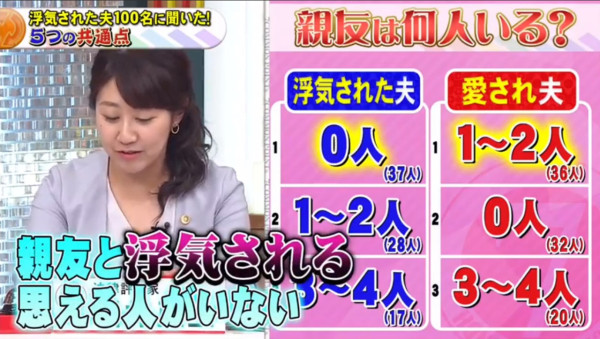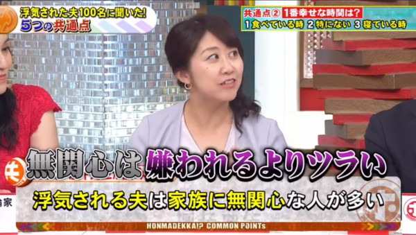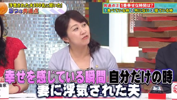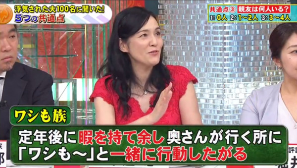很多人以為老公放工即回家最有安全感,但原來這也是隱形炸彈!幸福人夫多數會有1至2個知心好友;但曾被背叛的男人,共通點竟然是「沒有朋友」,生活圈子極度狹窄。 節目中處理過無數離婚訴訟的律師堀井亜生指出,丈夫缺乏社交圈子,會讓妻子覺得生活苦悶乏味,繼而想尋求刺激感。日本甚至有一個詞語叫「ワシも族(我也族)」,形容婚後丈夫就像一隻失去自我主見的「跟尾狗」,妻子去邊他都要跟著,只懂附和。這種缺乏個人魅力的相處模式,反而會加速女性對婚姻感到疲倦。