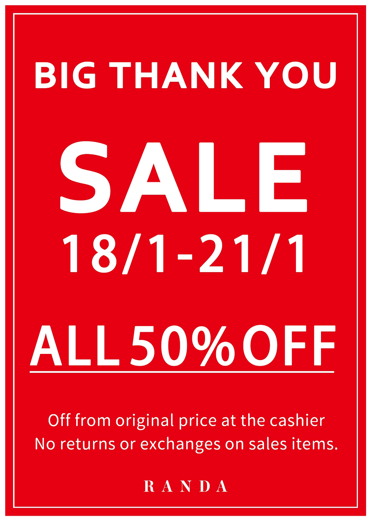 日本女裝鞋品牌RANDA將會一連4日進行BIG THANK YOU SALE。全店所有鞋款以半價發售。想買新鞋的你,不妨可以先看看以下款式。款式及鞋碼視乎店舖貨量,數量有限,售完即止。
