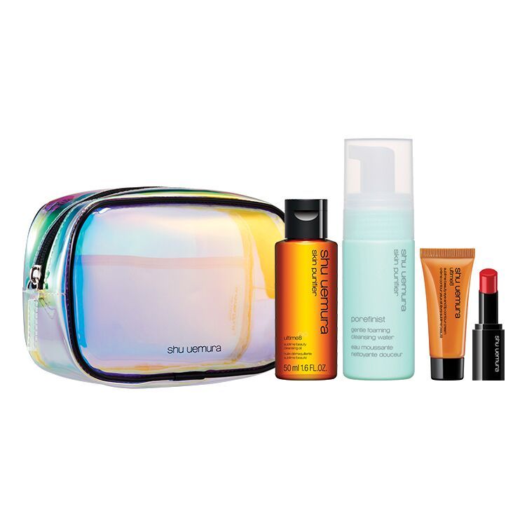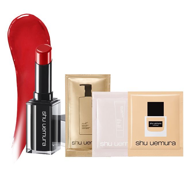 套裝產品包括:無色限漆光唇膏 #LS RD153、ultime8 黃金琥珀潔顏油試用裝(4ml) 、水潤隔離防曬底霜試用裝 (1ml) 、unlimited 無限輕透持妝粉底液試用裝 (1ml)