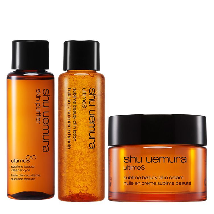 套裝產品包括:日本匠心限定ultime8黃金琥珀潔顏油(450ml)、ultime8 黃金琥珀潔顏油(50ml)、ultime8 黃金琥珀精華水(50ml)、水潤隔離防曬底霜 (7ml)