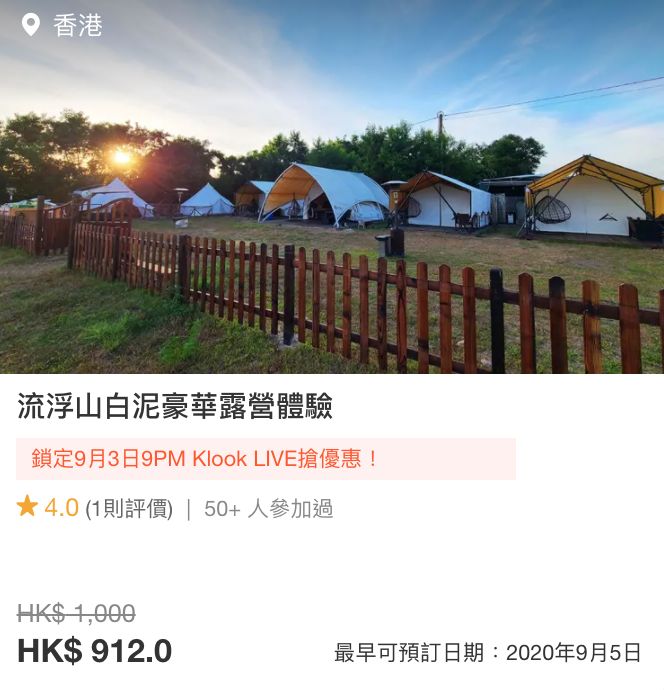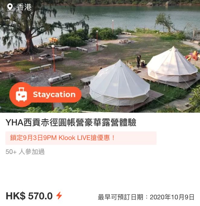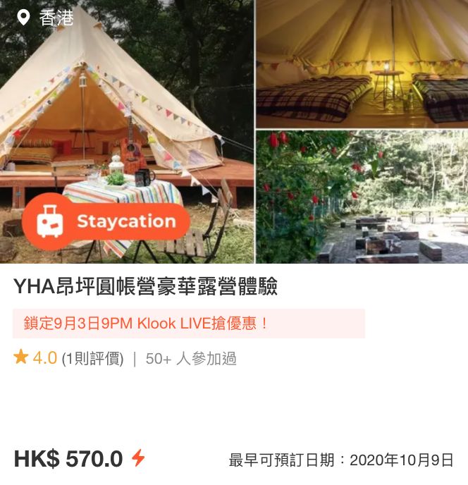 Klook時不時都會推出酒店及飲食等套票優惠,而今日(9月3日)晚上9pm舉行的Klook LIVE「請你STAY一晚」網上直播亦會送出快閃免費豪華露營體驗、精選酒店Staycation 買一送一及其他酒店Staycation 額外八折優惠!大家不妨相約家人閨蜜一起暫離繁忙的都市,好好放鬆一下休息,看著夜景星空,想想都覺得很浪漫!大家有興趣的話便不要錯過了~