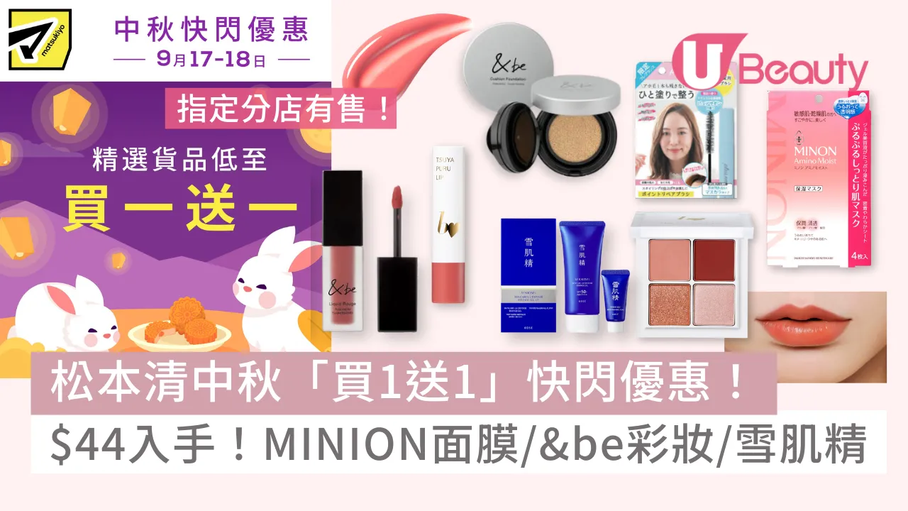 松本清買1送1|香港松本清指定分店,將於中秋佳節期間 9月17日至18日連續兩日,推出限時快閃優惠!精選多款美妝、護膚、個人護理產品及食品推出低至「買一送一」激抵優惠。折扣品牌包括&be、b idol美妝系列、雪肌精護膚品、MINON面膜、BOTANIST沐浴露等。同時段其他美妝及個人護理品牌,如CANMAKE、Bifesta等也有其他折扣優惠,詳情可以點擊下文圖片查看!提提大家,數量有限,售完即止。