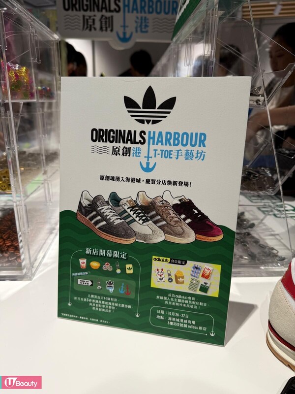 為慶祝重新開幕,adidas 將於10月26 至 27日期間推出獨家「原創港」活動。顧客只需購買指定的 T-Toe 鞋款(SAMBA、GAZELLE、SPEZIAL和SL72),即可自選五件與香港風格或海港城主題相關的掛飾、原創鞋帶及飾物,裝飾新鞋。此外,成為 adiClub 會員的顧客,還可解鎖更多個人化的主題掛飾及燙印鞋舌,令自創DIY設計更具個人魅力。