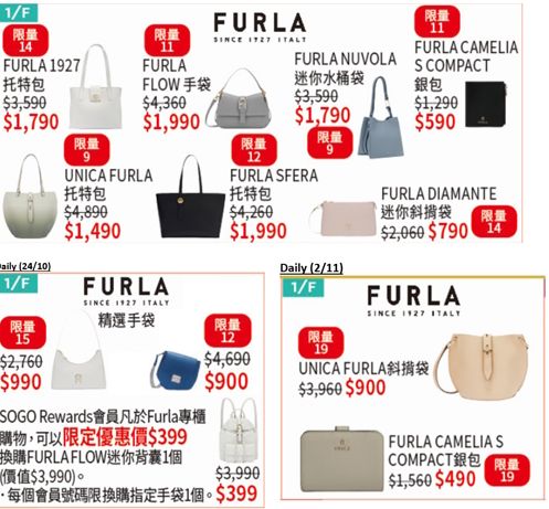 除了美妝、護膚品牌推出優惠外,意大利時尚品牌FURLA也驚喜推出不少折扣優惠!品牌以鮮艷色彩與優越的皮革工藝聞名,款式兼具時尚與實用性,成為不少小資女首個入手的手袋品牌!FURLA於SOGO感謝祭期間推出多款手袋優惠,部分人氣及經典款式更是低至一折起!